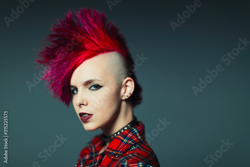 portrait, confident, cool, young, woman, adult, pink, mohawk, alone, alternative, attitude, background, black, culture, hair, head shot, individuality, lifestyle, 1, part of, people, person, posing, real, series, serious, shot, half face, studio, style, toughness, youth