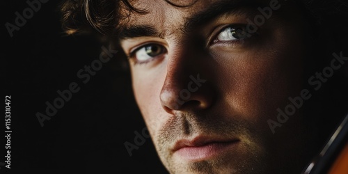Portrait featuring a male musician set against a dark backdrop, emphasizing his eyes, drawing attention to their captivating expression and the emotion they convey.
