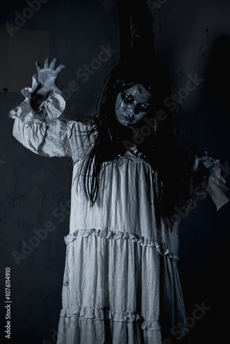 portrait female ghost with a face full of hatred and horror wearing a white dress in a haunted room