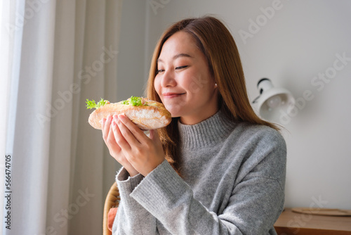 Portrait image of a young woman holding a piece of french baguette sandwich at home