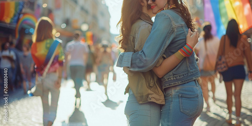 Portrait lesbian women hugging at LGBT Pride. The backdrop of pride and rainbow flags.