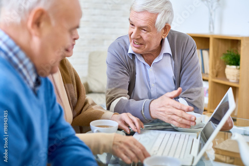 happy, smiling, modern, using, laptop, computer, group, people, friends, meeting, woman, man, elderly, old, age, senior, mature, pensioner, retired, retirement, home, house, living, room, sitting, table, leisure, enjoying, copy, space, talking, chatting, person, cyberspace, web