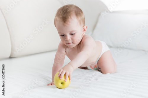 Portrait of 10 months old baby boy crawling on bed and taking big yellow apple