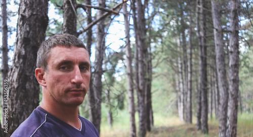 Portrait of a 35-year-old man of European appearance close-up in the forest in summer selective focus..
