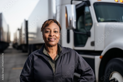 Portrait of a African American middle aged body positive female truck driver with infront of a truck in USA