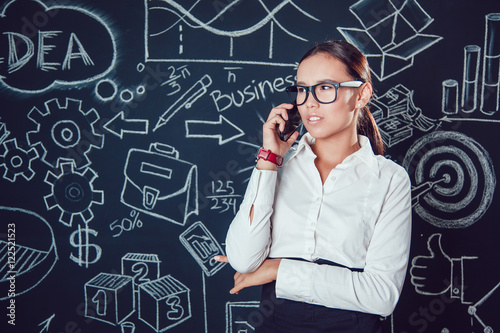 Portrait of a asian business woman in glasses on dark background with pictures and making phone call