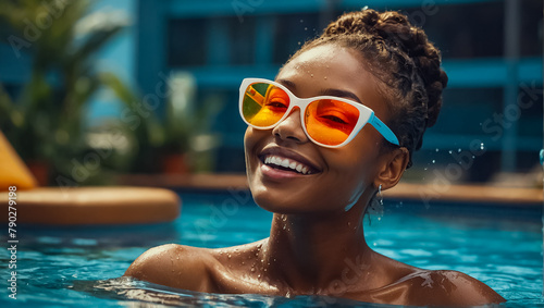 portrait, girl, african american, pool, sunglasses, woman, water, person, young, beauty, vacation, female, happy, pretty, attractive, fashion, resort, model, sunny, hair, holiday, relax, slim, spa, swimming, face, lifestyle, wet, smiling, fun, sun, tropical, travel, enjoy, poolside, leisure, chic, lady, luxury, honed, posing, relaxation, relaxing, spain, happiness, swim