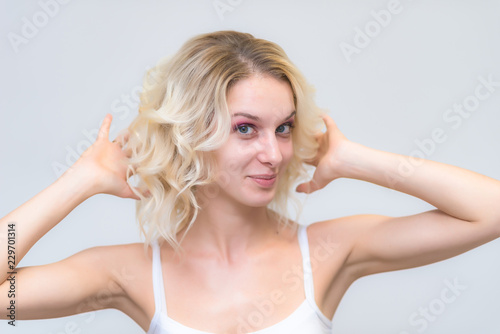 Portrait of a beautiful blonde girl while working as a professional beautician make-up artist.