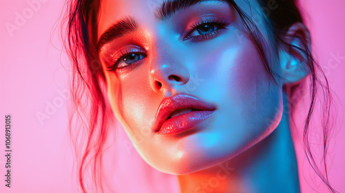 Portrait of a beautiful brunette woman with bright eyes and flawless skin, wearing glamorous makeup