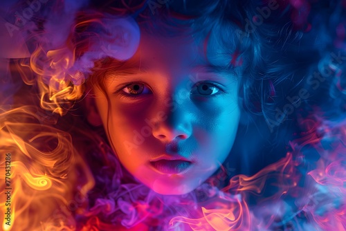 portrait of a beautiful child looking in the camera, made from colorful glowing smoke in the style of digital art, on a dark background