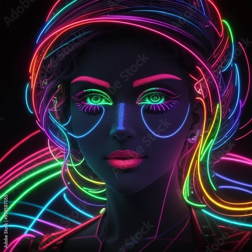 Portrait of a beautiful girl drawn with neon lines on a black background. Illustration of a young woman, futuristic, artificial mind concept,science fiction, glossy neon reflections. Night club poster