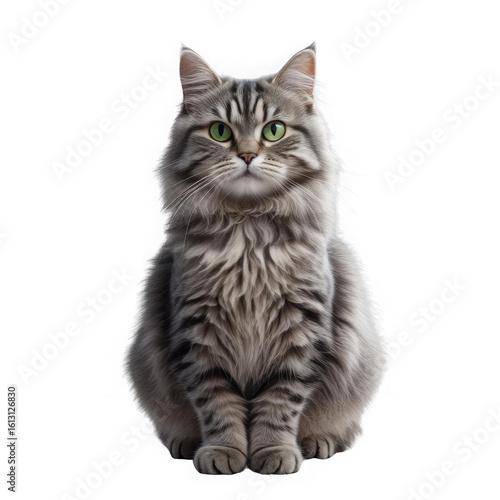 Portrait of a beautiful gray striped cat sitting, isolated on transparent background