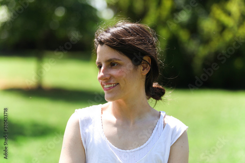 beautiful, brunette, caucasian, day, female, green, horizontal, nature, park, peace, people, relax, relaxing, single, sunny, woman, white, girl, person, adult, adult, 20s, grown-up