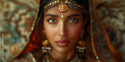 woman, indian, portrait, beautiful, jewellery, gold, traditional, clothes, culture, beauty, fashion, asia, ethnic, saree, saree, hindu, india, make up, eye, brown, lip, nose, face, young adult, one person, indoor, luxury, interior, elegance, tradition, heritage, vibrant, colourful, exotic, henna, tikka, necklace, earring, headpiece, veil, background, textile, pattern, closeup, head shot