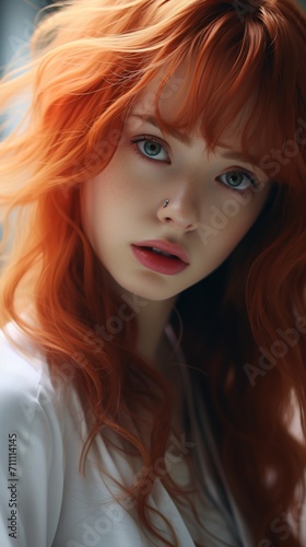 redhead, woman, portrait, green eye, piercing, nose ring, long hair, wavy hair, white shirt, natural makeup, studio photography, head shot, beauty, fashion, model, caucasian, one person, realistic, photorealistic, hi-res, detailed, intricate, stunning, mesmerizing, captivating, alluring, seductive, enchanting, bewitching, entrancing, mesmeric, hypnotic, breathtaking, eye-catching, compelling
