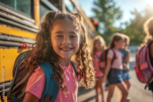 Portrait of a beautiful smiling girl against the background of a school bus and other children