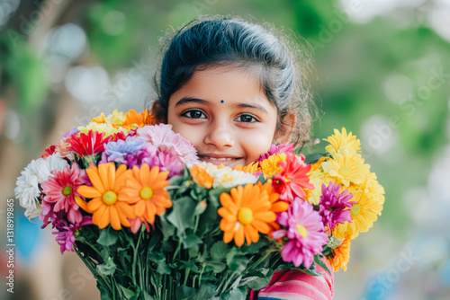 Portrait of a beautiful smiling Indian girl kid with a bouquet of spring flowers