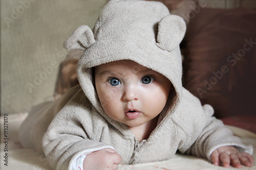 Portrait of a beautiful the little baby was lying on his stomach. Big blue eyes.