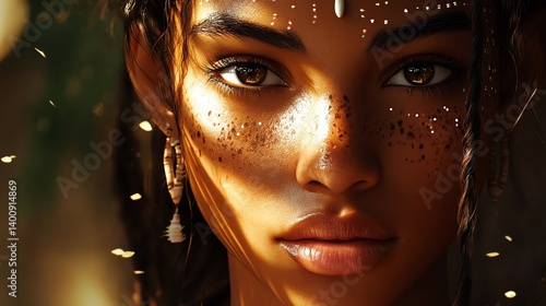 woman, looking, portrait, closeup, dark skin, ethnic, tribal, make-up, freckle, decoration, jewellery, earring, headpiece, braid, hair, eye, eyebrow, face, lip, nose, forehead, skin, artificial, generated, gold, shadow, lighting, sparkle, detail, artistic, background, soft, fantasy, concept, beauty, fashion, style, culture