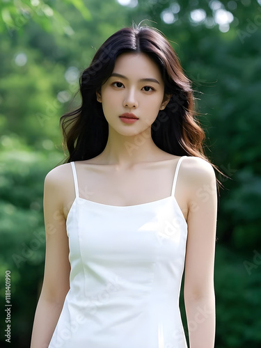 white, dress, woman, profile, side, view, green, background, long, hair, wavy, sleeve, flowing, fabric, elegant, fashion, style, portrait, soft, light, casual attire, relaxed, modern, chic, minimalistic, serene, calm, aesthetic, beauty, simplicity, natural, feminine, graceful, delicate, timeless, classic, sophisticated, model, face, glamour, eye, lady, studio, black, elegance, person, people, smile, looking