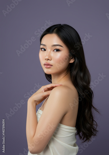 asian woman, beautiful woman, portrait, model, beauty, skincare, hair care, long hair, wavy hair, black hair, natural makeup, make-up, cosmetic, beauty product, fashion, style, elegant, attractive, glamourous, woman, girl, female, studio shot, purple background, shoulder, face, eye, hair, skin, lip, body, healthy, smooth, soft, glowing, radiant, young, adult, beautiful