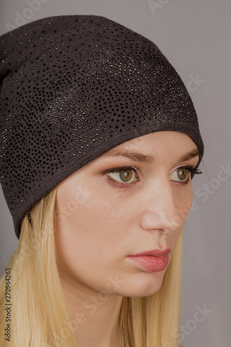Portrait of a beautiful young girl in a stylish headdress with natural makeup on a gray background.