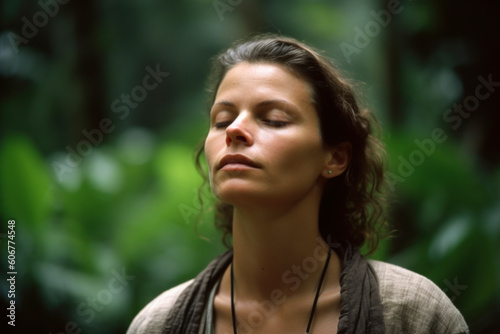 mindfulness, relaxation, meditation, mental health, inner peace, portrait, photo, 30s, female, adult, woman, open, top, sleek, long, wool, clothing, smart, layer, autumn, stylish, fashion, feminine, fashionable, clothes rack, ecosystem, lush, jungle, rain, nature, green, tree, exotic, background, wilderness, landscape