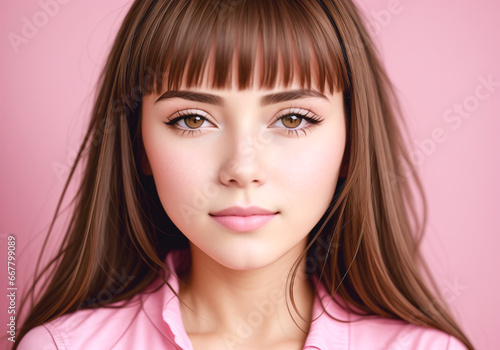 Portrait of a beautiful young woman with long brown hair on a pink background