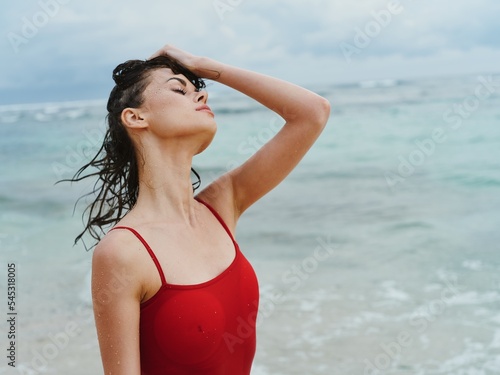 Portrait of a beauty woman on the beach with beautiful tanned skin and wet hair against the ocean summer vacation