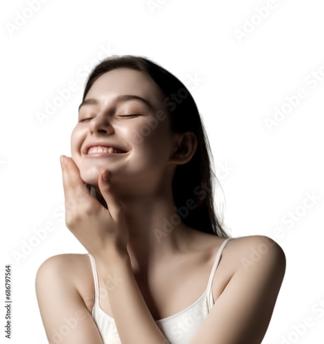 Portrait of a beauty young woman with perfect clean skin. The model closes her eyes, tilts her head slightly, and smiles. Her hands touch her face. Youth and Skin Care Concept. transparent background.