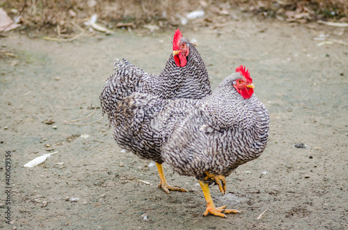 Portrait of a black and white decorative domestic chicken in the yard of a private house