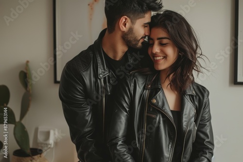 Portrait of a blissful indian couple in their 20s sporting a classic leather jacket in front of modern minimalist interior