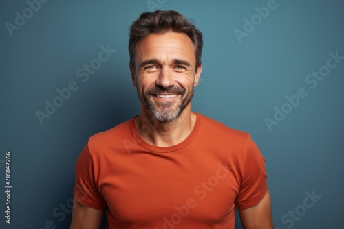 Portrait of a blissful man in his 30s dressed in a casual t-shirt against a solid color backdrop. AI Generation