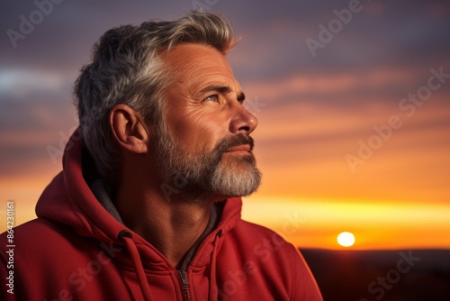Portrait of a blissful man in his 50s sporting a comfortable hoodie isolated in vibrant sunset horizon