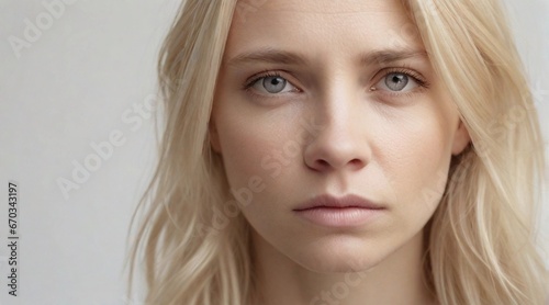 Portrait of a blonde hair woman with a deep sad expression against white background, background image, AI generated
