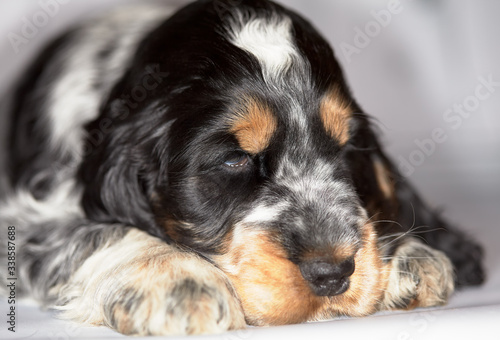 Portrait of a bright, elegant puppy of the English cocker spaniel. A thoughtful look. The background is blurred.