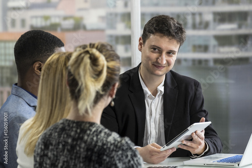 adult, boss, business, career, collaboration, communication, computer, conference, confidence, cooperation, corporate, creativity, discussion, education, entrepreneur, expertise, explaining, female, group, cyberspace, ipad, job, leadership, man, manager, meeting, multi-ethnic, occupation, office, online, people, planning, portrait, presentation, problem solving, professional, project, small business, tablet, talking, teamwork, technology, woman, work, working, workplace