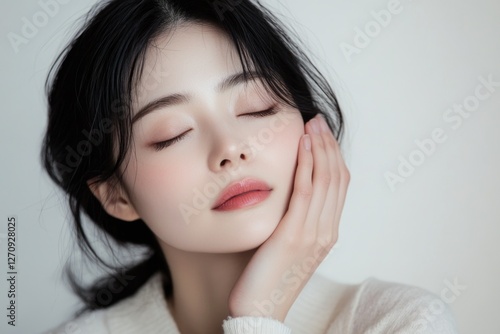 Portrait of a calm Japanese woman with closed eyes, gently touching her face on a soft, light background.