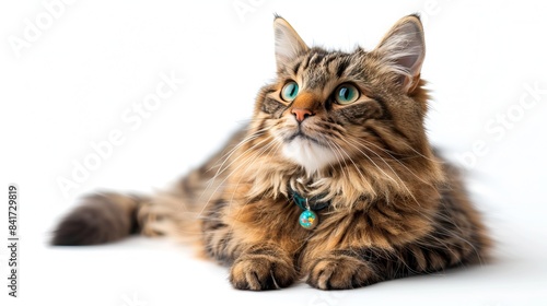 felino, tabby cat, green eye, fluffy, domestic cat, pet, closeup, adorable, whisker, animal portrait, studio shot, white background, collar, relaxed, cat, majestic, calm, peaceful