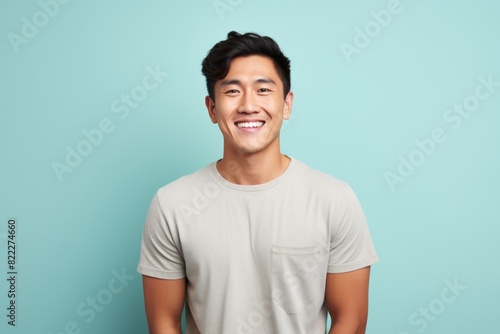 Portrait of a cheerful asian man in his 20s smiling at the camera in front of blank studio backdrop