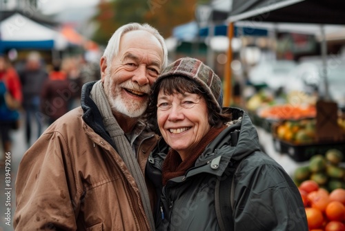 Portrait of a cheerful caucasian couple in their 70s donning a durable down jacket isolated on bustling farmer's market