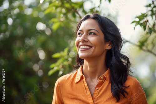 Portrait of a cheerful indian woman in her 30s wearing a simple cotton shirt against a vibrant city park. AI Generation