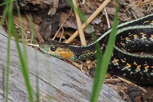 Portrait of a Common Garter (Red-spotted Garter) basking on a log