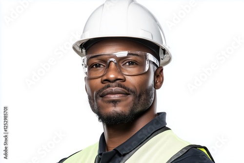 Portrait of a confident male construction worker wearing a white safety helmet and glasses on a plain white background. representation of professionalism and safety
