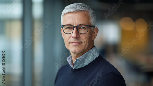 Portrait of a confident, middle-aged business man with glasses and gray hair, generative AI