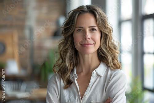 Portrait of a confident middle-aged woman in a casual white shirt, standing in a modern office environment. Professional and business lifestyle concept. Ideal for corporate profiles