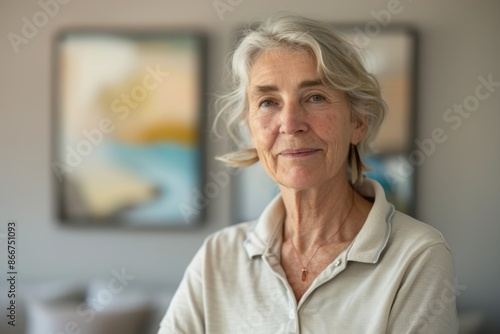 Portrait of a content caucasian woman in her 60s wearing a breathable golf polo in modern minimalist interior