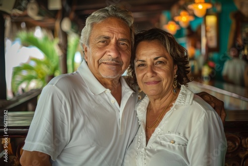 Portrait of a content latino couple in their 50s wearing a classic white shirt on tropical beach bar background