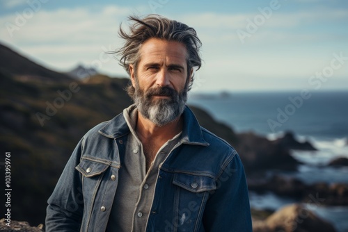 Portrait of a content man in his 50s sporting a rugged denim jacket while standing against rocky shoreline background