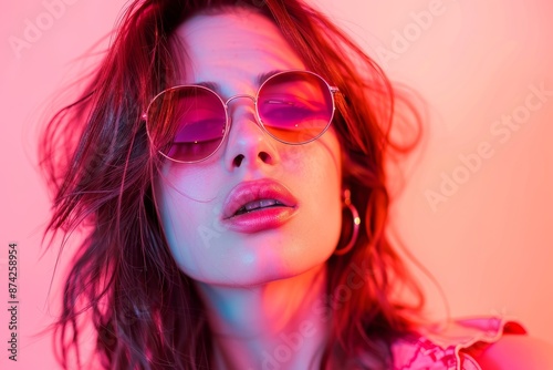 Portrait of a content woman in her 30s wearing a trendy sunglasses in front of pastel or soft colors background